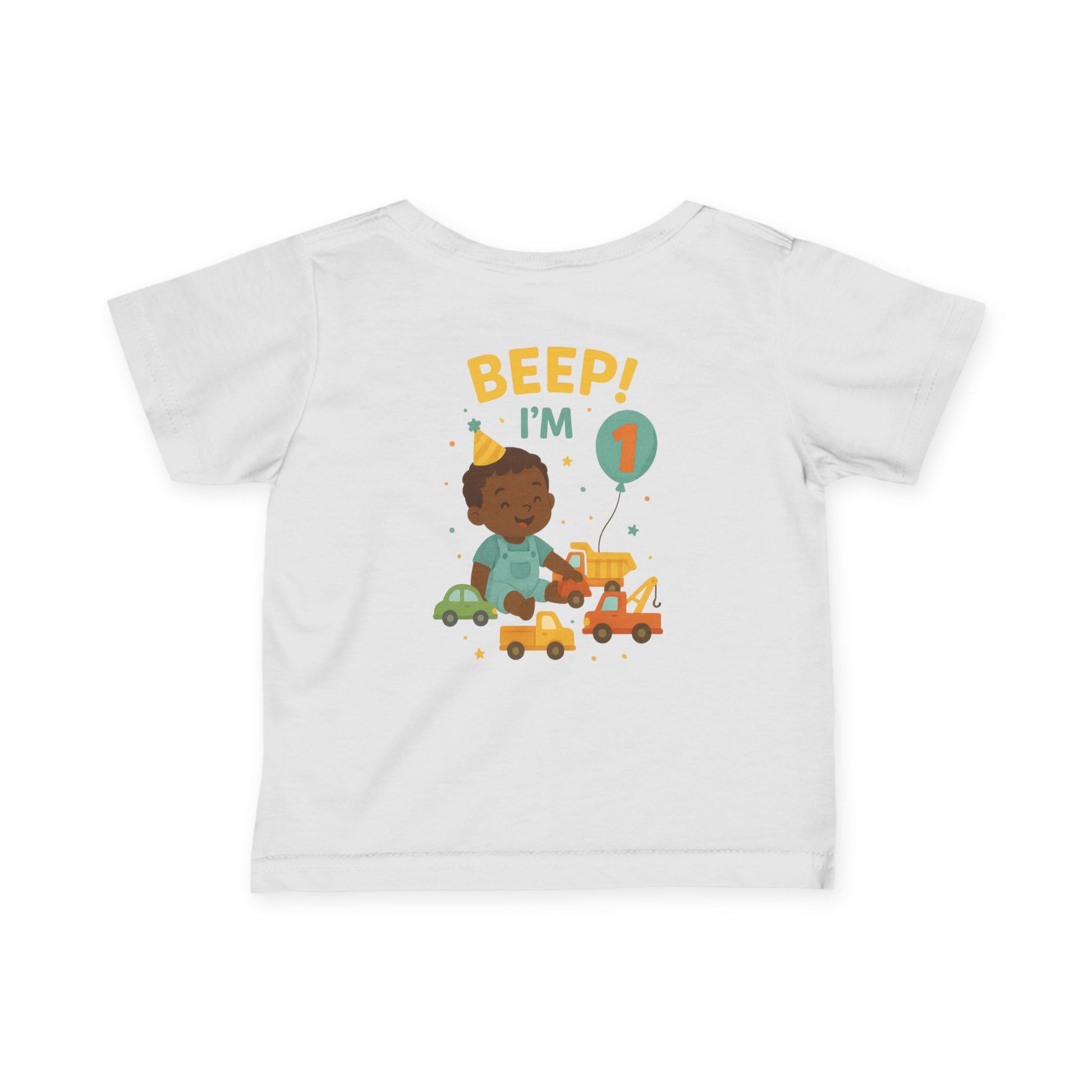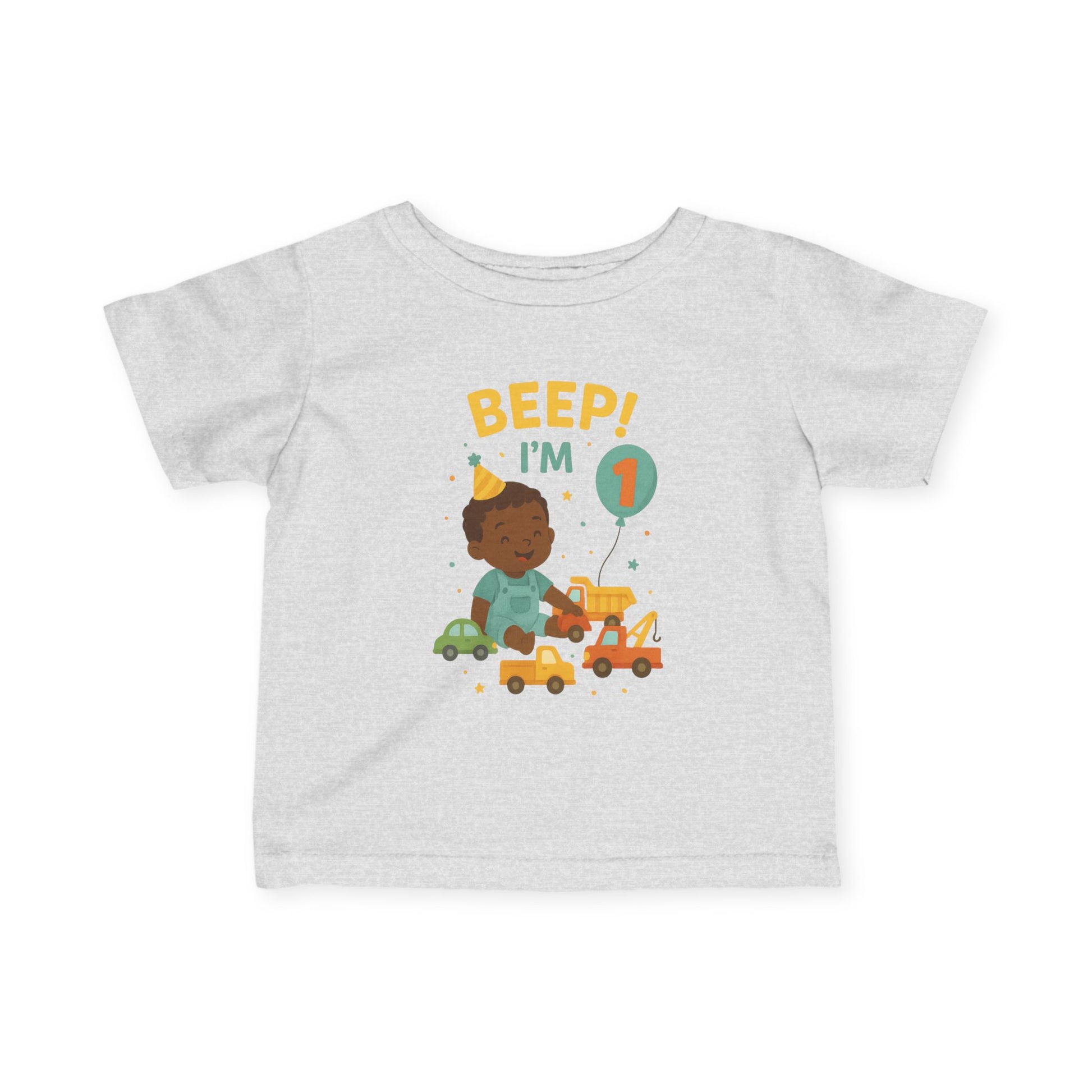 Adorable infant fine jersey tee featuring toy cars and trucks, perfect for one-year-olds, with an african-american child design. This cute tee is designed to be comfortable and durable, making it a great addition to any toddler's wardrobe. Perfect for birthday parties, everyday wear, and special occasions.